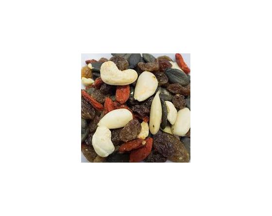 Fruits séchés : cubes de figues* (agent d’enrobage : farine de riz*) (40%), cubes de dattes* (40%), cramberries* infusées au jus de pomme concentré* (agent d’enrobage : huile de tournesol*) (12%), amandes douces d’abricots* (8%)